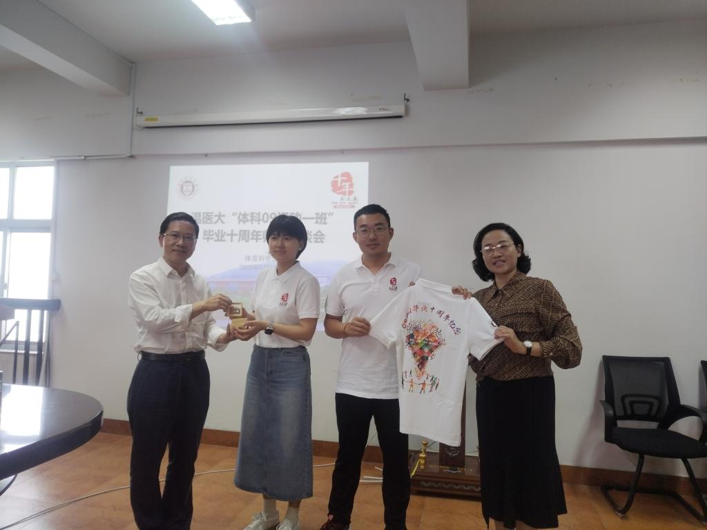 原体育科学学院党委书记李旭东老师和滕青院长为毕业生授予校友纪念章和纪念文化衫。随后毕业学子们参观了体育馆和田径场。校友们在田径场上和老师们又重温了当年的上课情景。