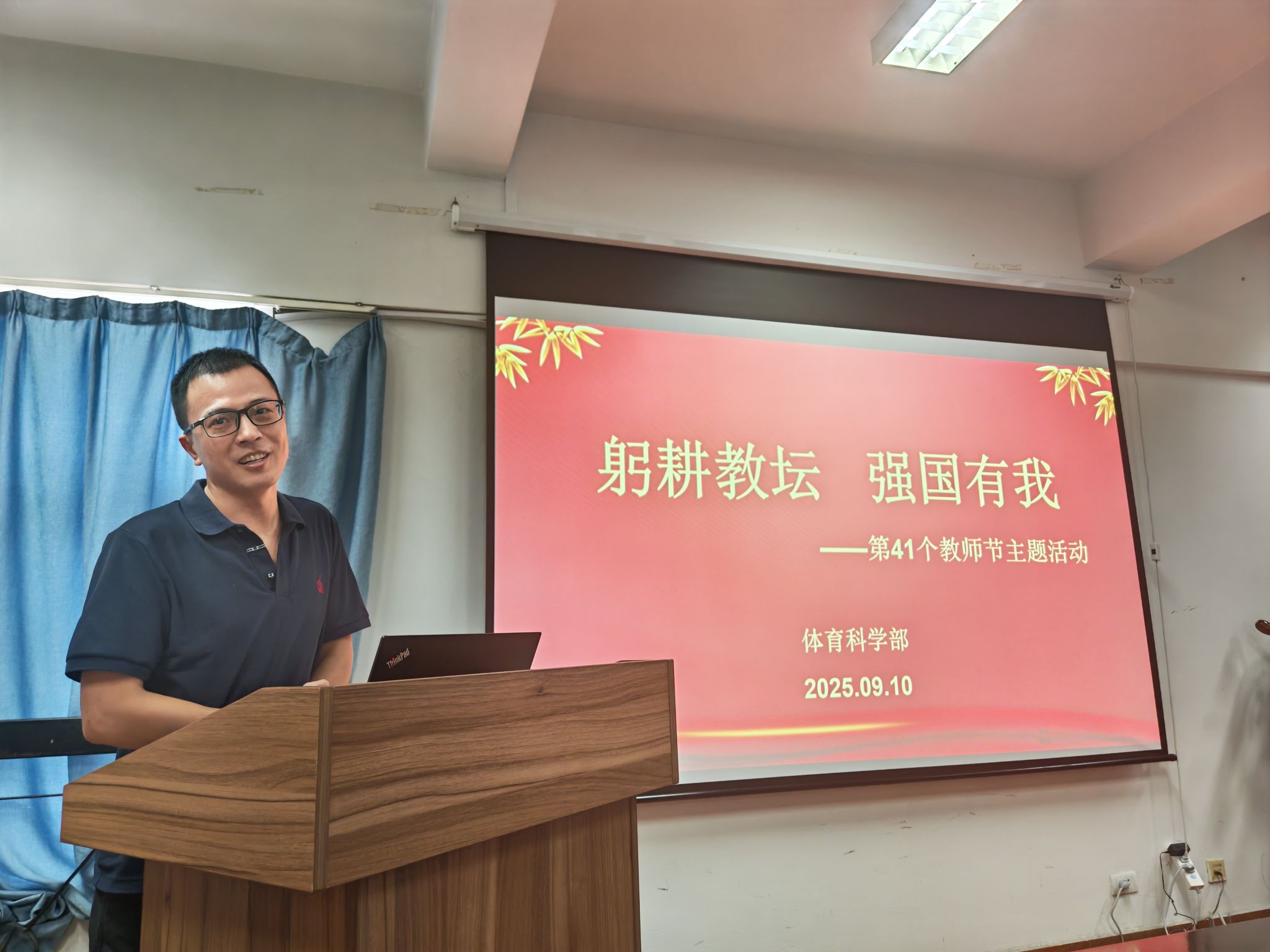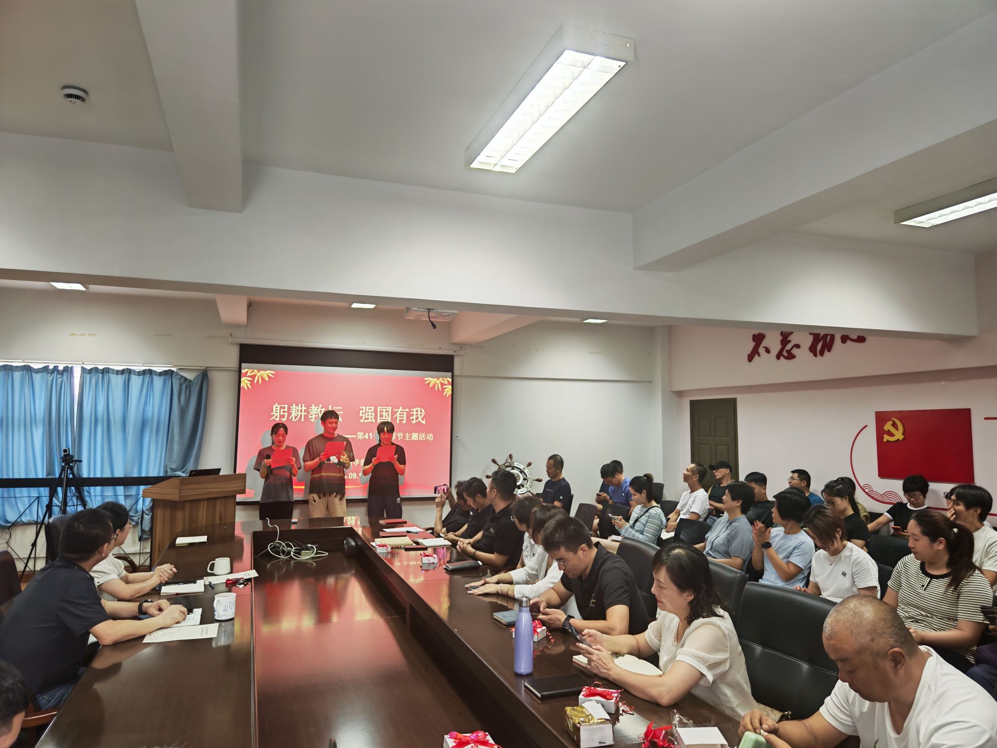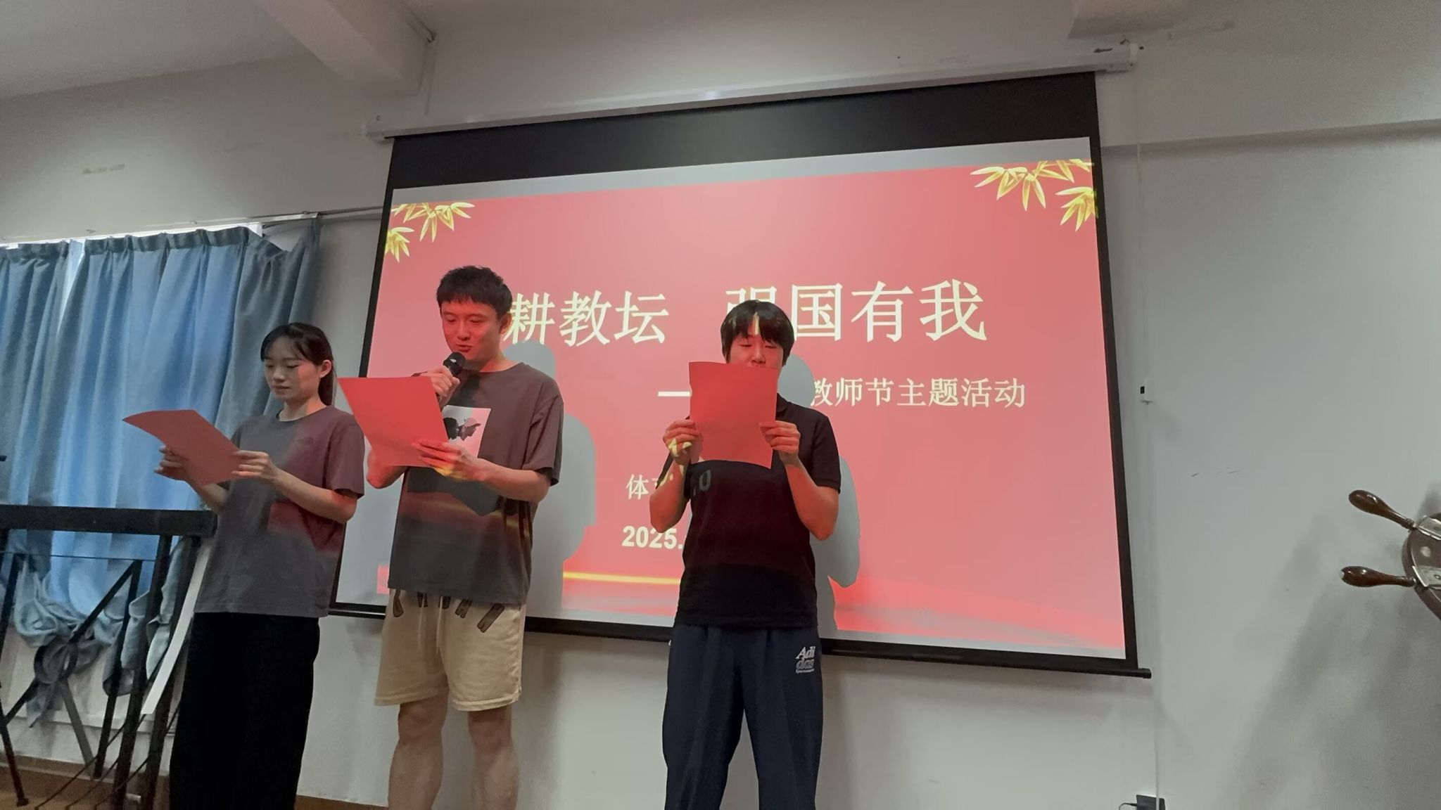 当天,91黑料 在体育馆402会议室举办“躬耕教坛 强国有我”教师节主题活动。全体教职工齐聚一堂,共同庆祝属于自己的节日。王在韬、张千轶、林汝涵三位年轻教师朗诵《谢谢您,老师!》,铿锵有力的声音、真挚饱满的情感,生动表达了青年教师对教育事业的热爱。
