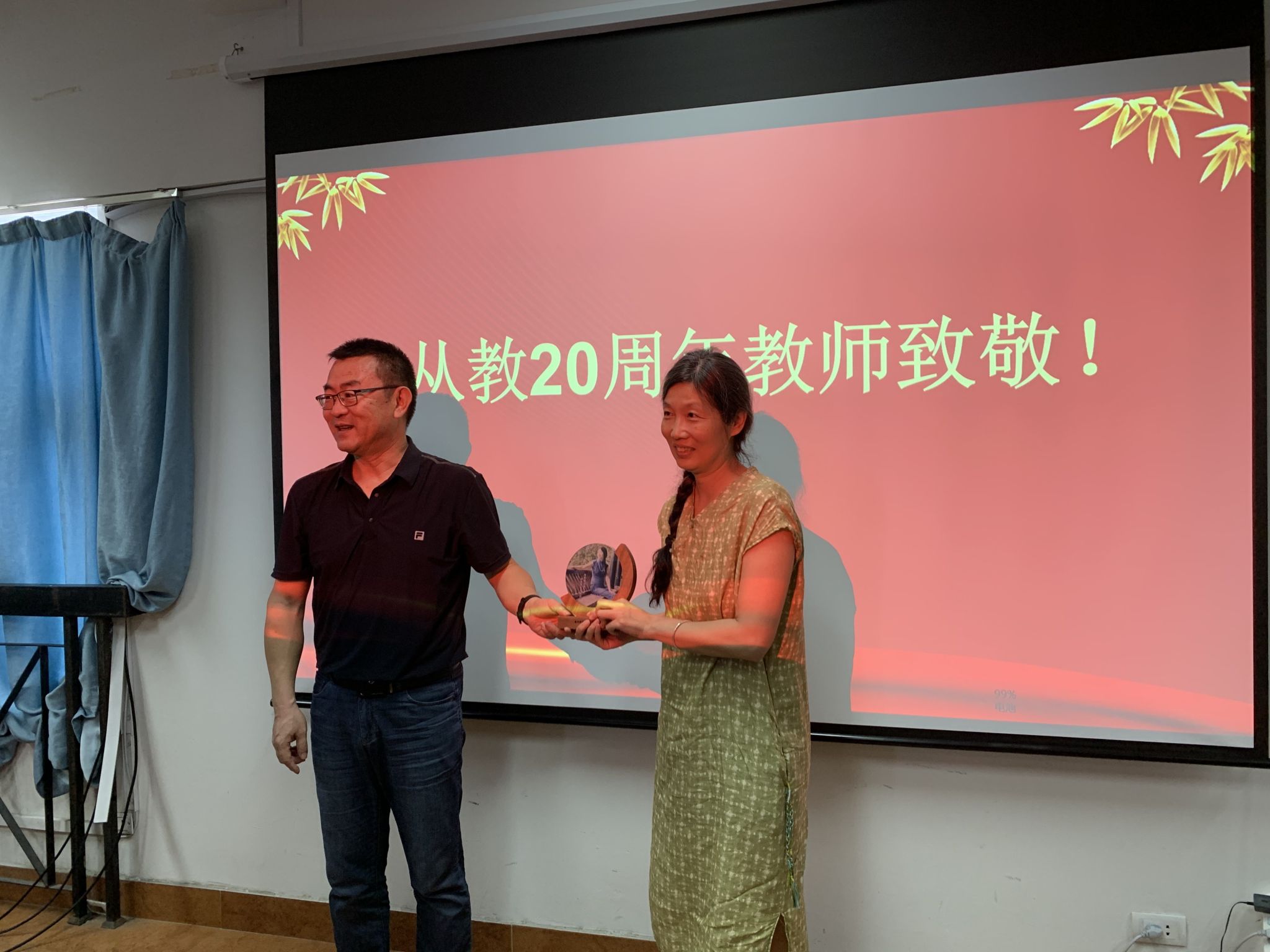 新老教师们围坐在一起,畅叙往昔,描绘未来。中青年教师张娜、黄浩分享了他们数十年如一日坚守课堂的教育故事。他们的话语饱含深情,既有对往昔岁月的回望,也有对未来发展的期待。刘海平主任代表学部向教龄满20年的傅珊教师赠送礼物。